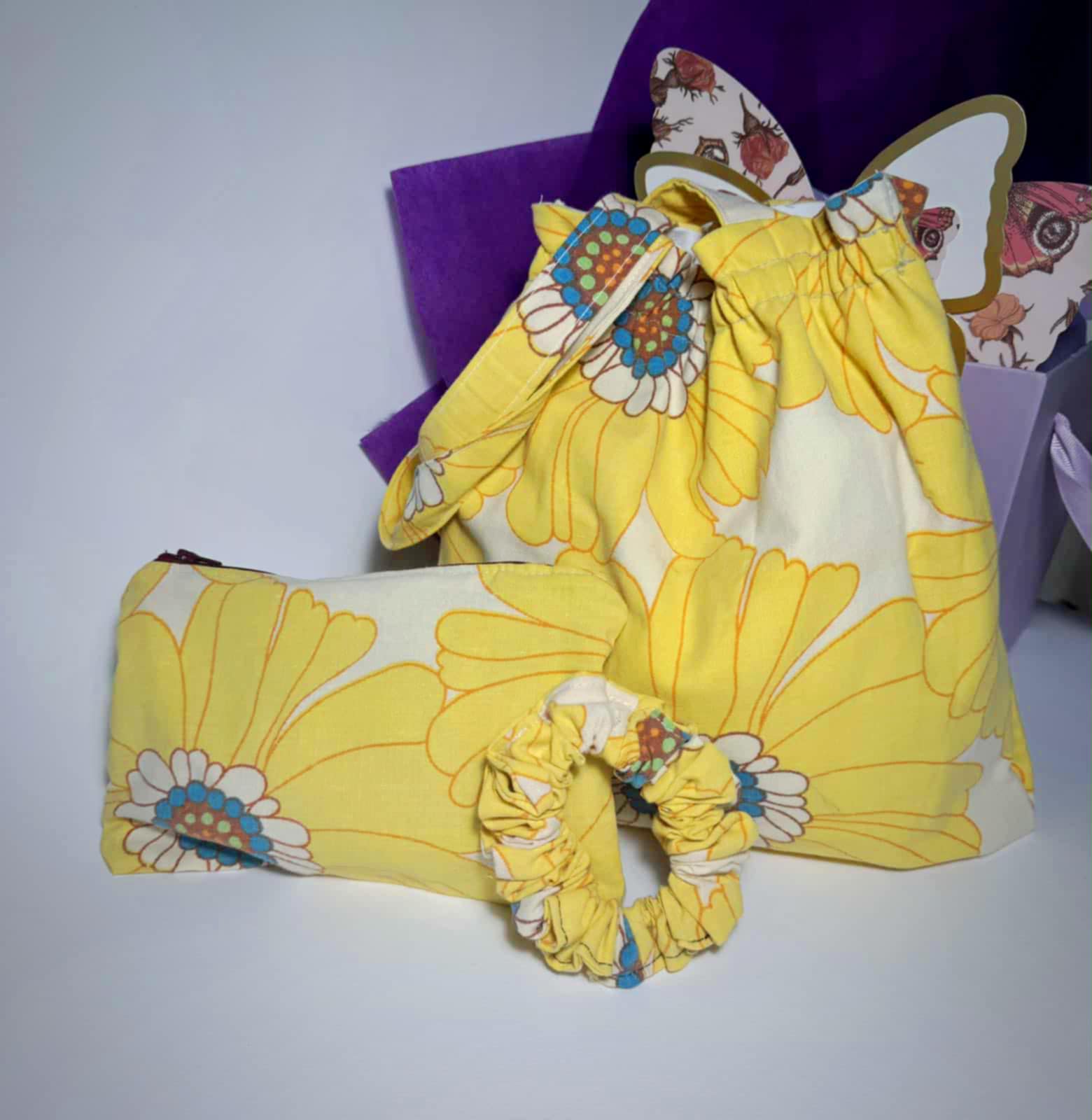 Чанта с подплата тип торба ,с ластик за компактност,вътрешен джоб,несесер в същия цвят ,само с подплата за повече обем. Памучен плат.Подарък скрънчи.Размери чанта 25/28, несесер 21/13 см.