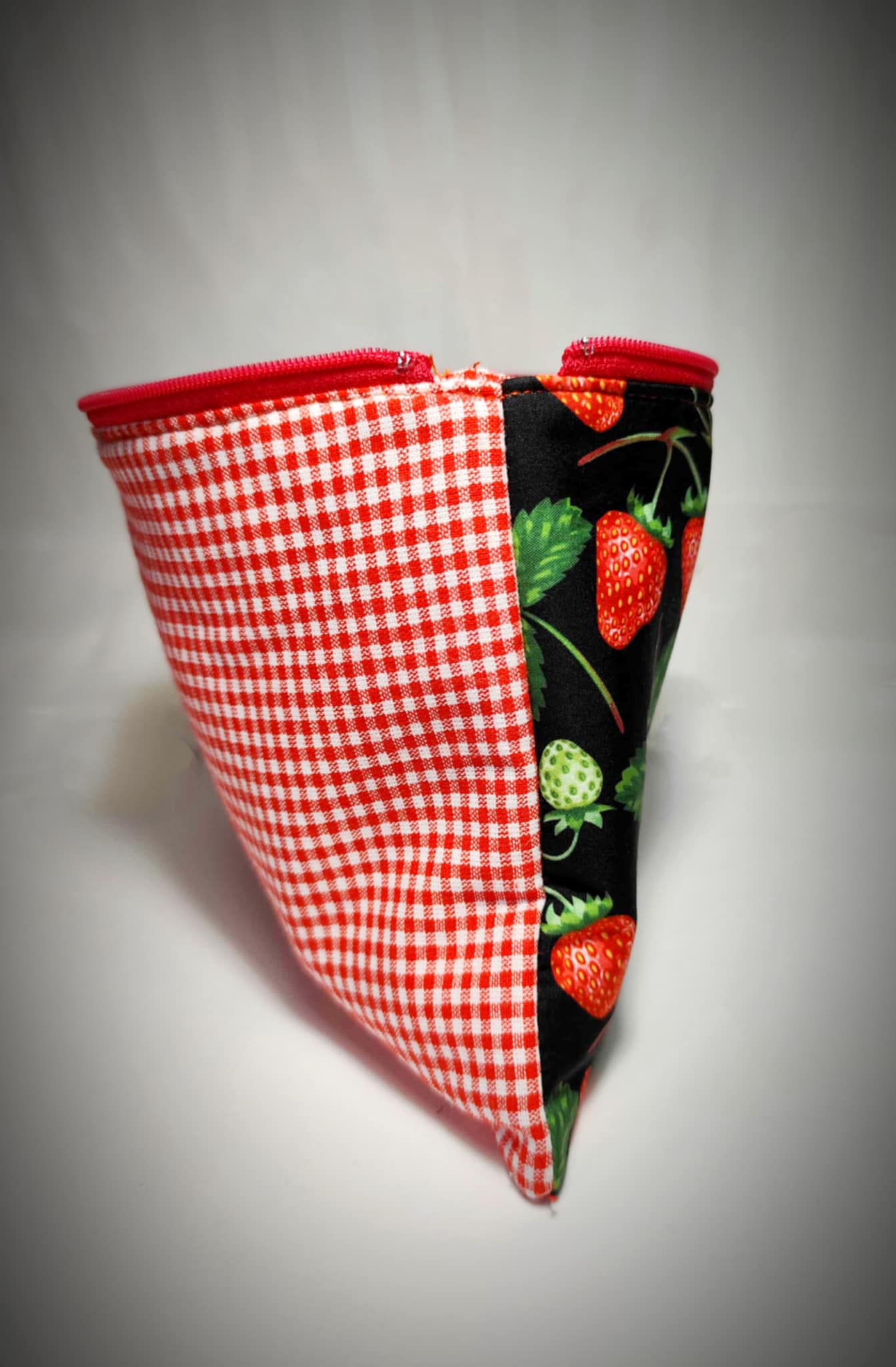 Удобен, практичен несесер.Лице с акцент ягоди, гръб ситно червено- бяло каре. Подходящ за всякакви нужди.
