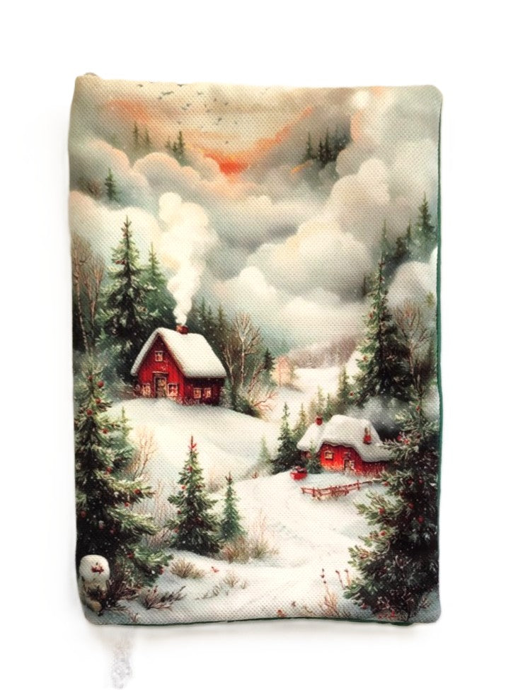 Очарователна подвързия с мотив на уютно зимно домче, обградено от сняг и топла празнична атмосфера. Подходящ за ученически принадлежности, козметика или дребни аксесоари. Идеален като малък празничен подарък.