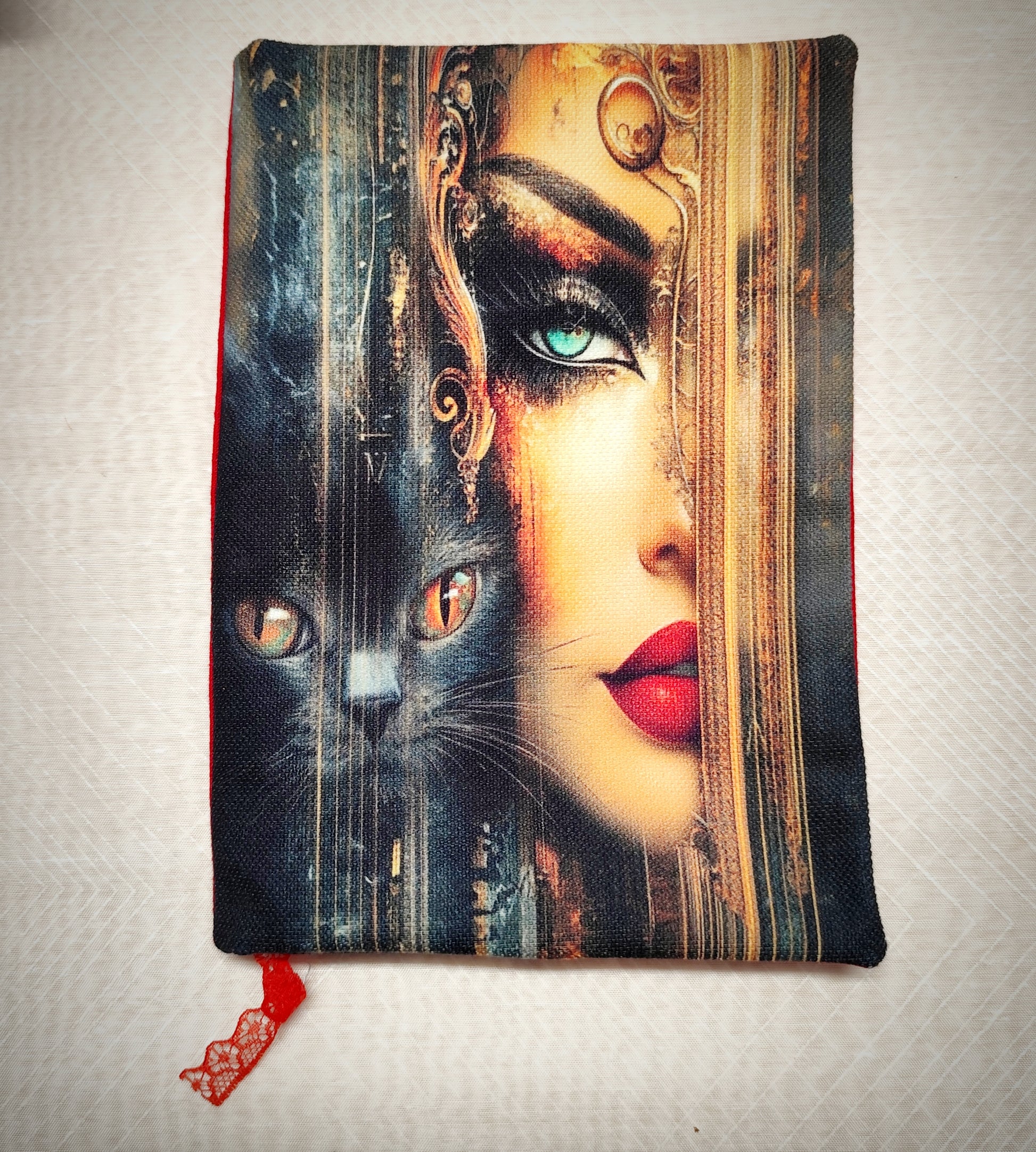 Калъф за книга с уникален принт, съчетаващ мистичното лице на жена и черен котарак — символи на тайнственост и магия. Вътрешната част е стилно оформена в червено и тъмносиньо, с деликатна червена дантела, която служи и като отбелязка. Калъфът предпазва книгата от надраскване и прегъване, като придава елегантен и артистичен вид.