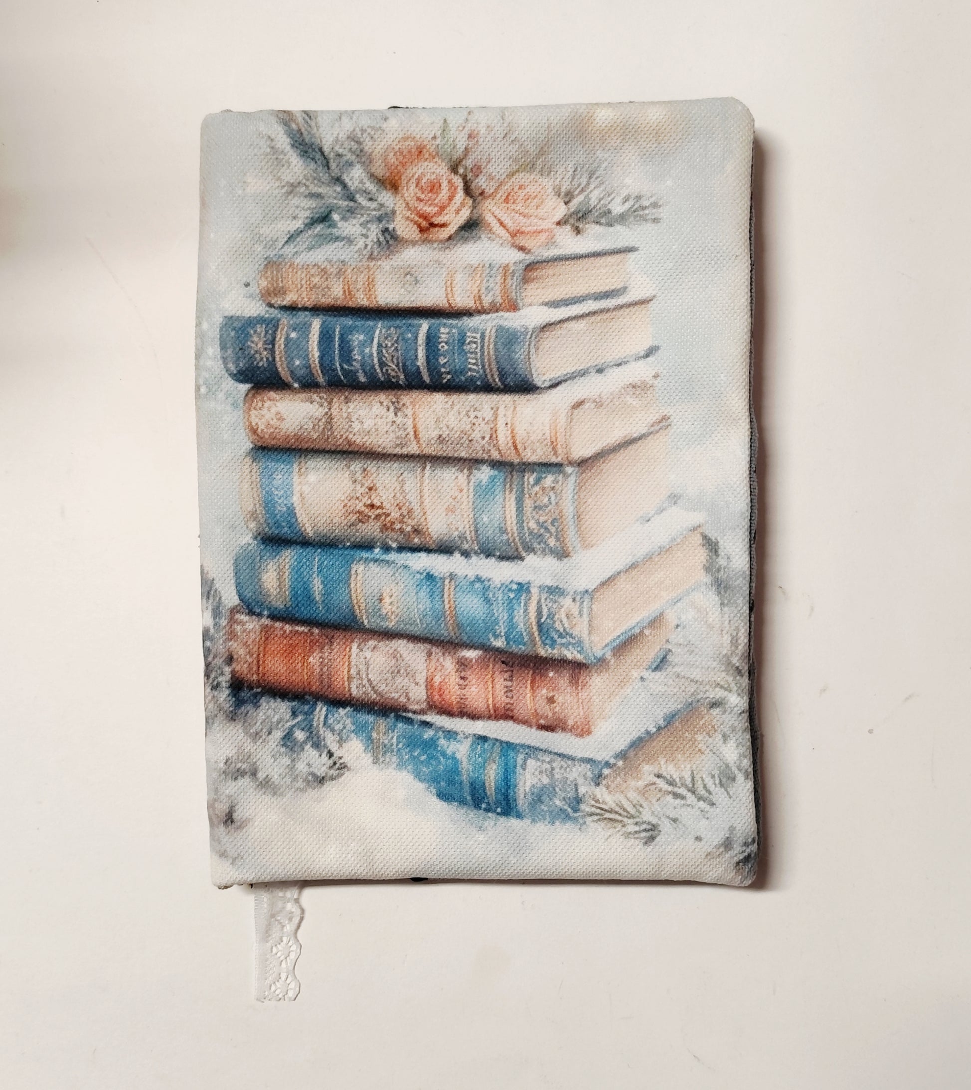 Елегантна ръчно изработена подвързия с художествен принт на подредени класически книги в нежни зимни нюанси. Фините детайли, розовите цветя и снежният ефект създават усещане за уют и приказност. Подходяща за подарък и идеална за защита на любимите ви книги при пътуване или ежедневна употреба.