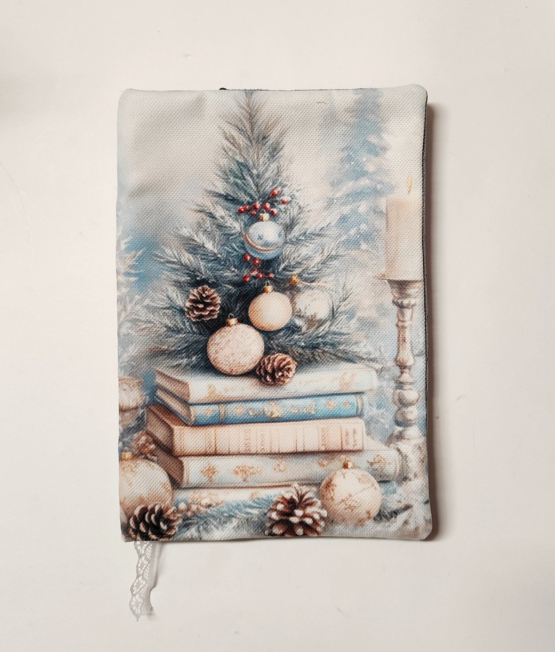 Елегантна ръчно изработена подвързия с художествен принт на подредени класически книги в нежни зимни нюанси. Подходяща за подарък и идеална за защита на любимите ви книги при пътуване или ежедневна употреба.