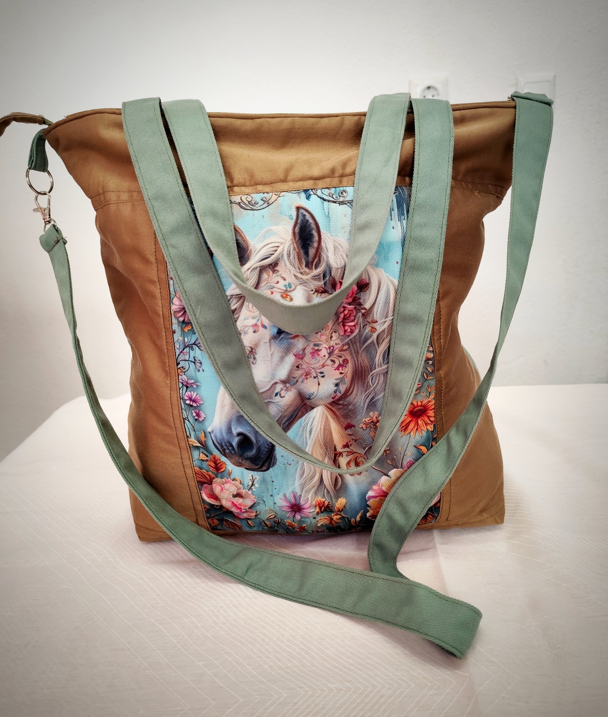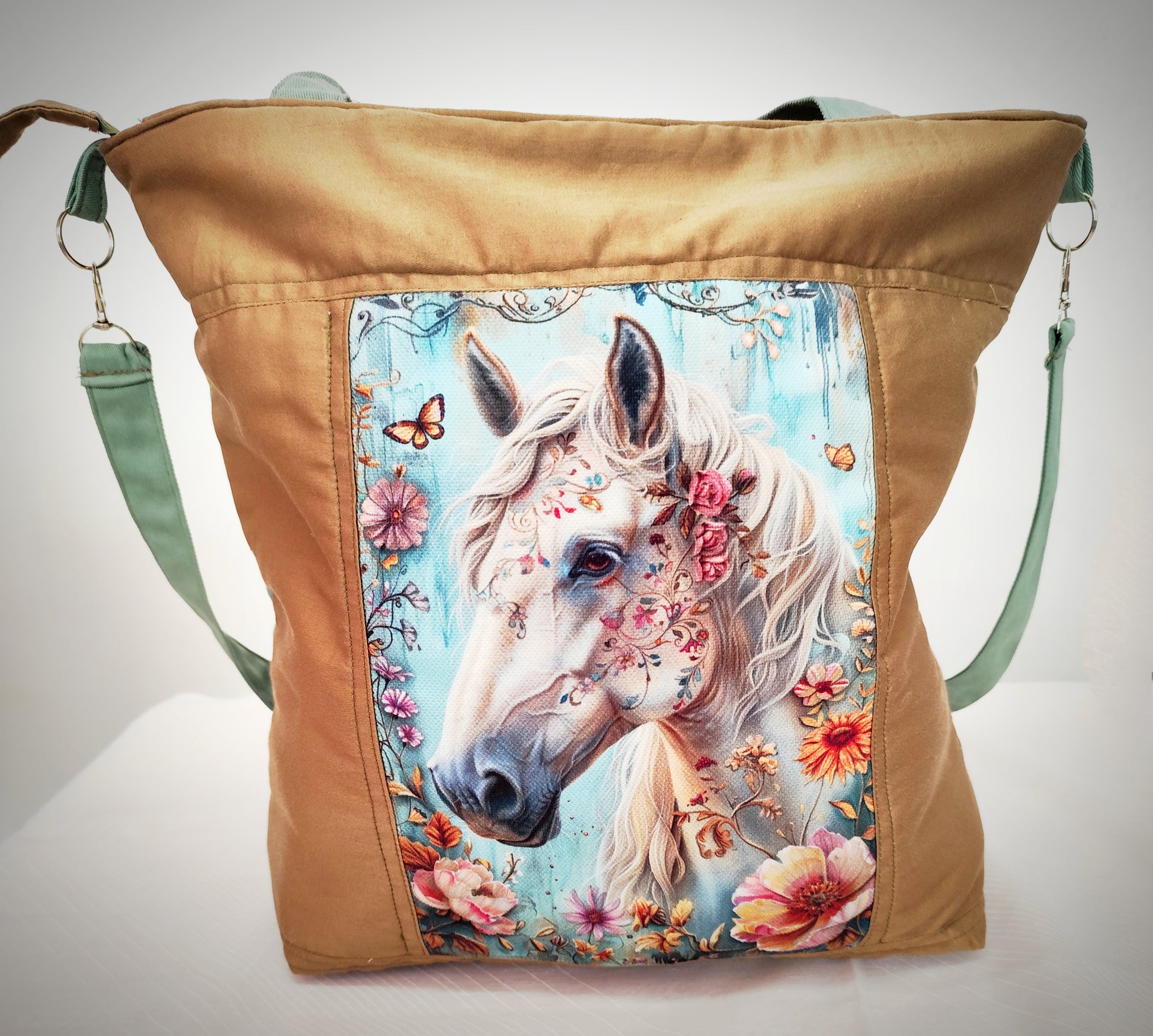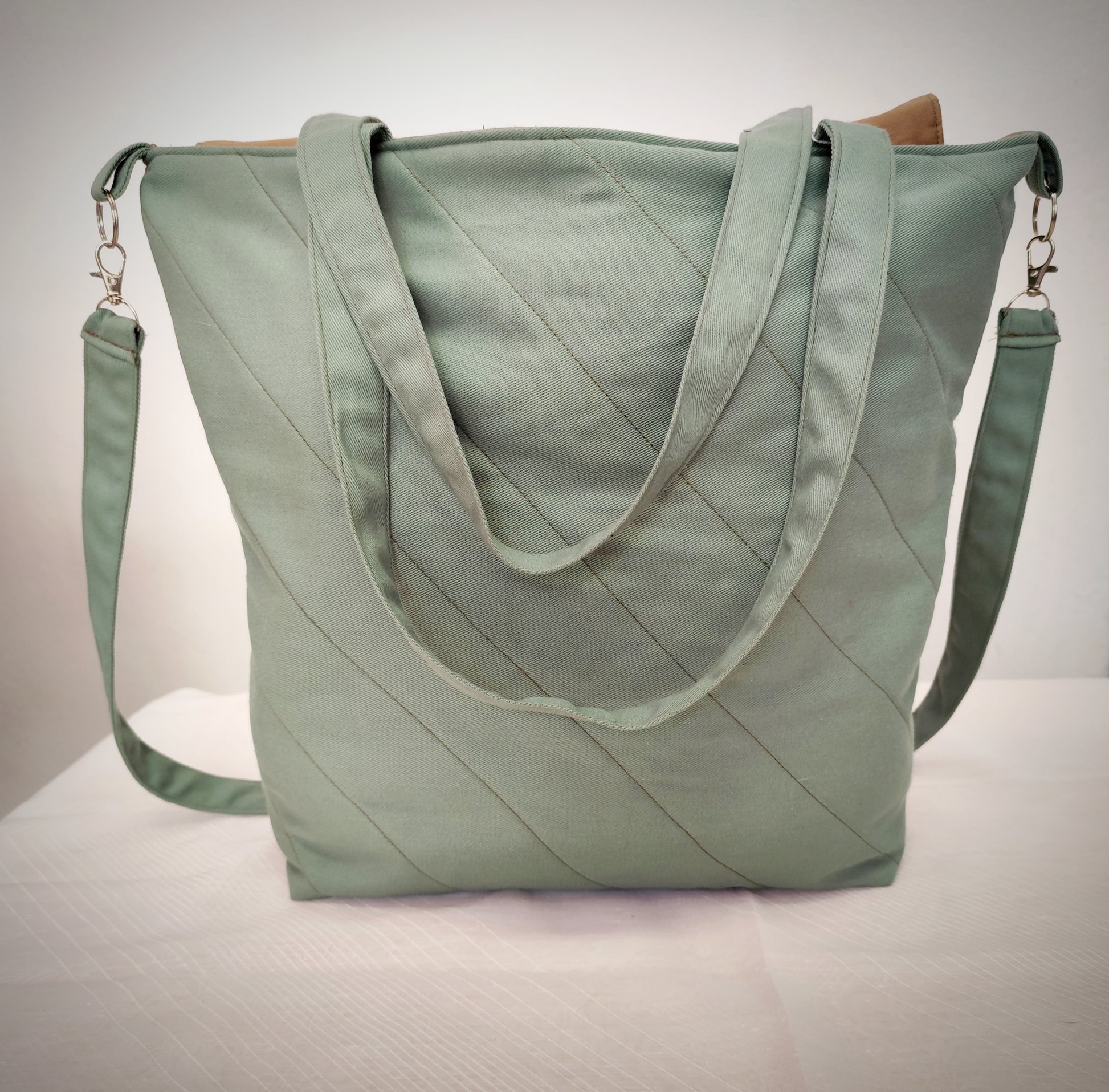 Практична, голяма чанта тип сак.Памучни платове , вата и подплата. Дълги дръжки, дръжка за през рамо ,два вътрешни джоба. Закопчаване с цип.