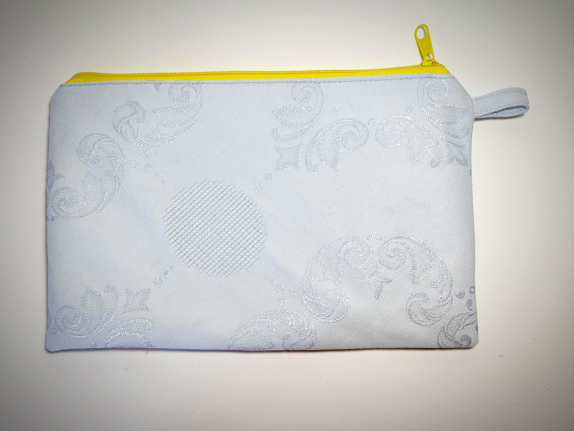 Очарователен несесер , от едната страна е в нежно светлосиньо с елегантни орнаменти, а от другата – с цветна илюстрация на пухкаво пиленце сред цветя и пеперуди. Подходящ за козметика, ученически принадлежности или малки аксесоари.